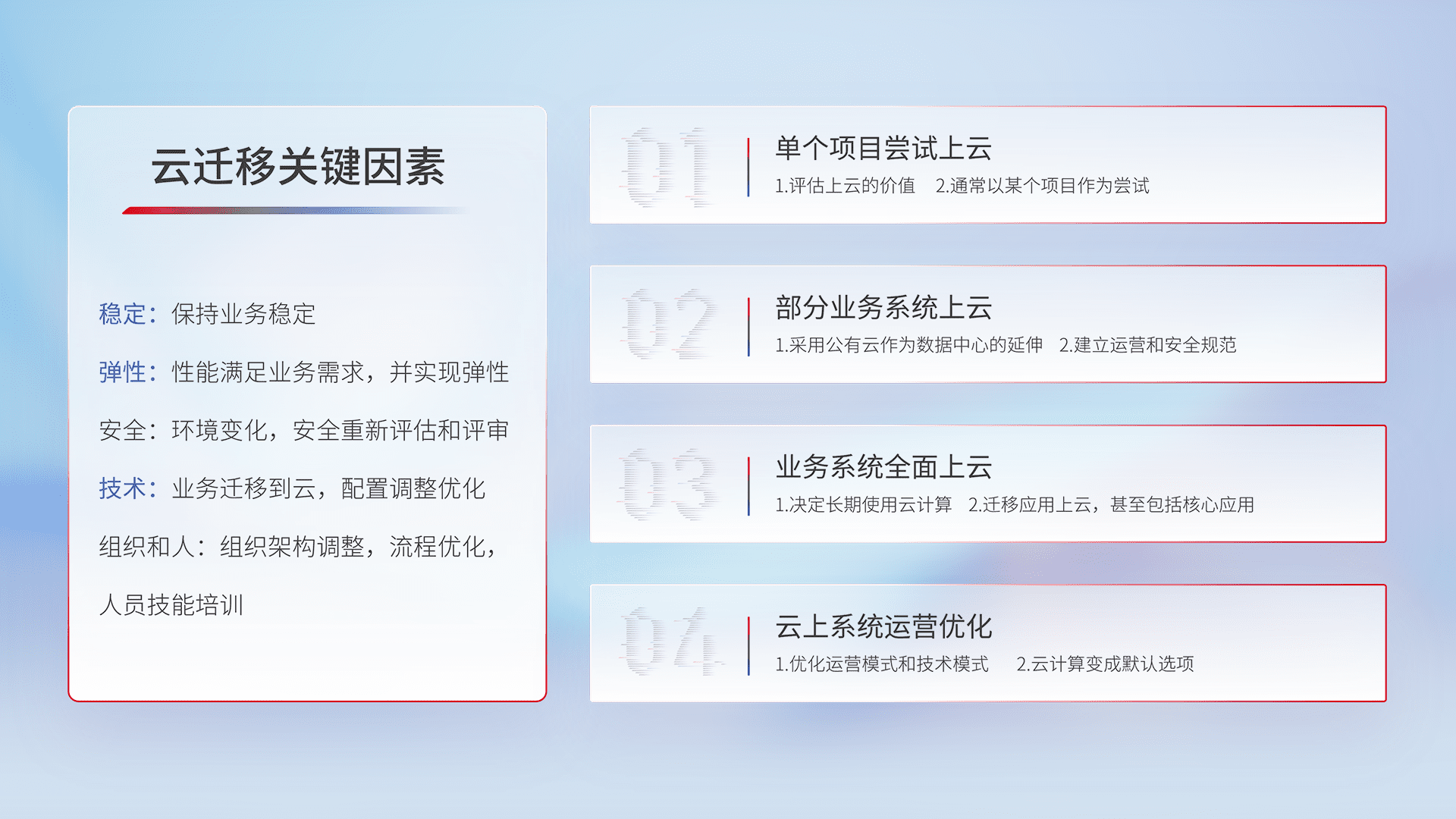 结合实际业务,,从规划设计、、云平台选型、、云原生改造、、、、数据迁移、、、集成交付,,迁移全过程为客户识别最佳上云路径,,,做好风险识别管理,,,,设计网络架构、、身份权限、、、安全审计合规、、、、操作审计、、、、日志审计、、监控告警策略、、多站点容灾设计等,,,对云上基础设施进行整体规划,,,,提升IT治理水平,,以满足弹性、、、高可用、、、、高性能的需求。。。