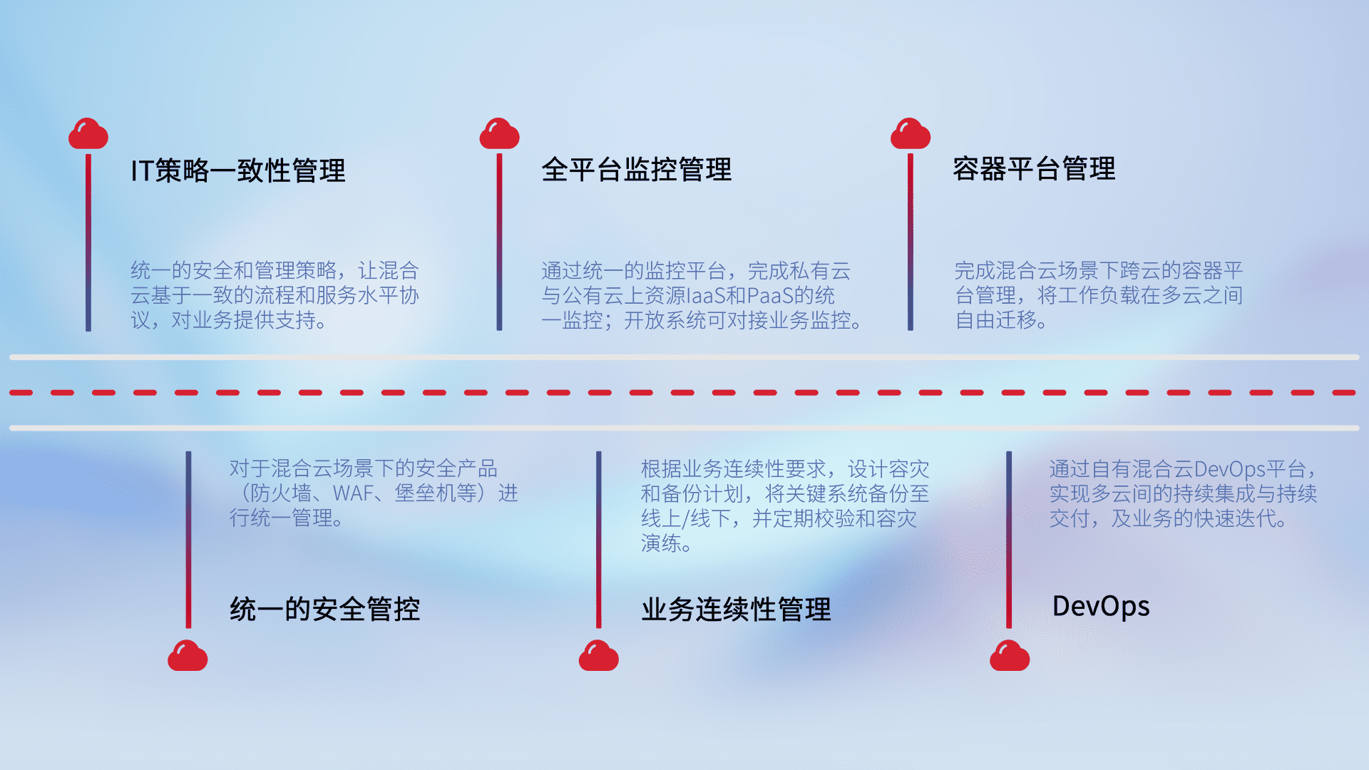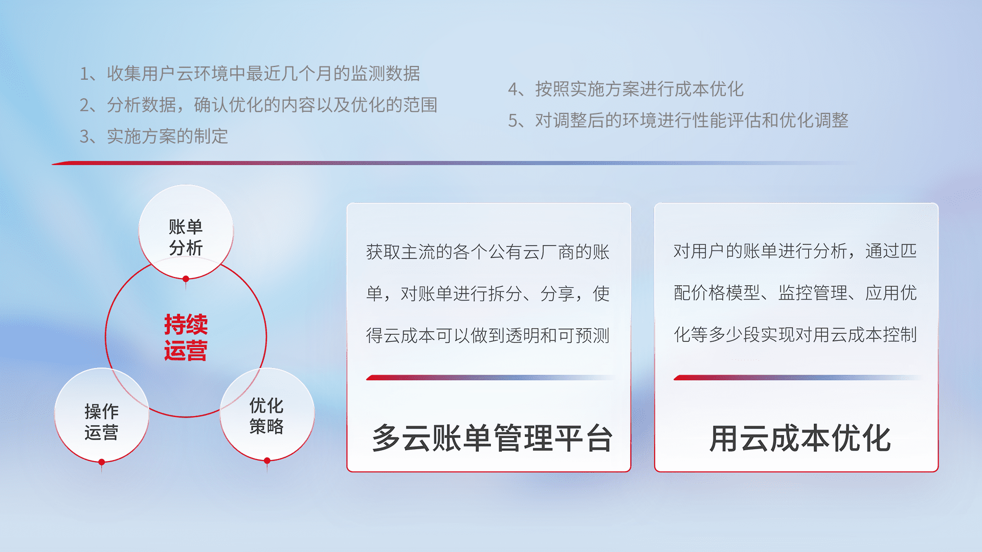通过多云纳管,,以统一的资源数据模型把客户的云资源进行抽象和封装,,,进而实现对多云资源的统一操作,,,,保障云资源管理的可靠性、、、稳定性与可用性。。。。量身定制化运维内容,,配置、、、、开发运维、、、补丁管理、、、备份、、、监控、、认证和访问管理、、、审计和日常巡检等,,,,保障在用云过程中的可靠度,,,,稳定度以及高可用率。。。。