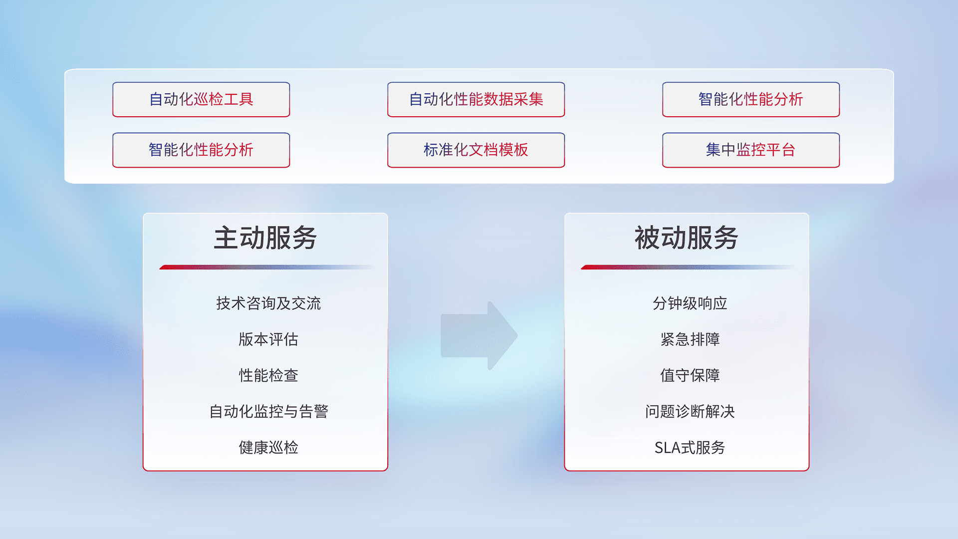智能化工具和标准化文档,,,保障服务质量,,,,提供主动服务(包含技术咨询、、、版本评估、、、性能检查、、、自动化监控与告警、、、、健康巡检)和被动服务包含(分钟级响应、、、、紧急排障、、值守保障、、问题诊断解决、、、SLA服务)。。